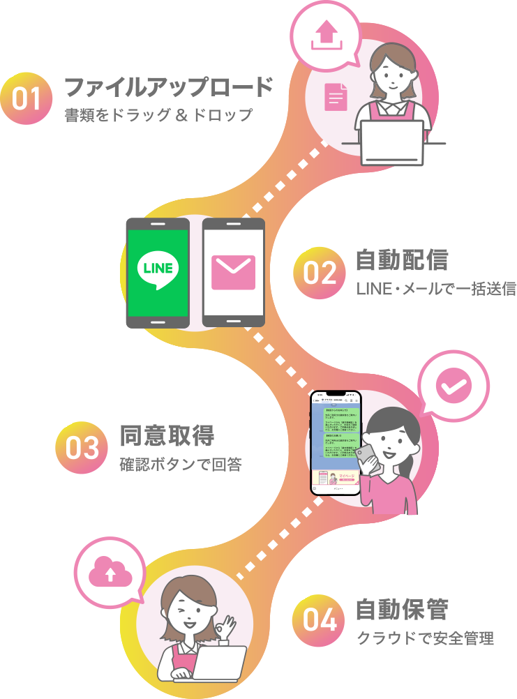 ファイルをアップロードするだけで、書類配信、同意取得、未回答管理、クラウド保管まで自動化。複雑な書類業務も、誰でも迷わず扱えるシンプル設計です。これまで電話や郵送に頼っていた間接業務も、CareLoopならワンストップで完結。
