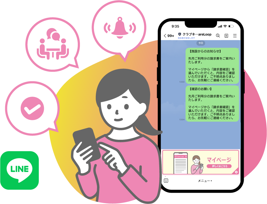 誰もが使い慣れたLINEを活用するから、通知や同意も迷わずスムーズに。CareLoopをご契約いただくと各種LINEの初期設定も対応。請求書の閲覧やダウンロード、お知らせ情報がCareLoopのマイページに整理され、通知だけでは追いにくい情報も一元管理。双方の情報共有を強化し、管理体制をバツグンに高めます。