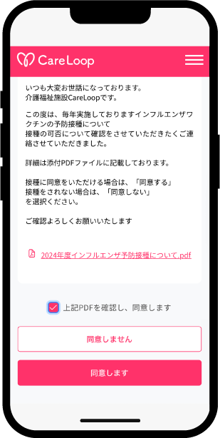 ご家族はスマホでワンタップ同意・拒否。未同意者の確認やリマインド、回答期日管理も簡単。記録は自動保存されエビデンス管理も安心。
